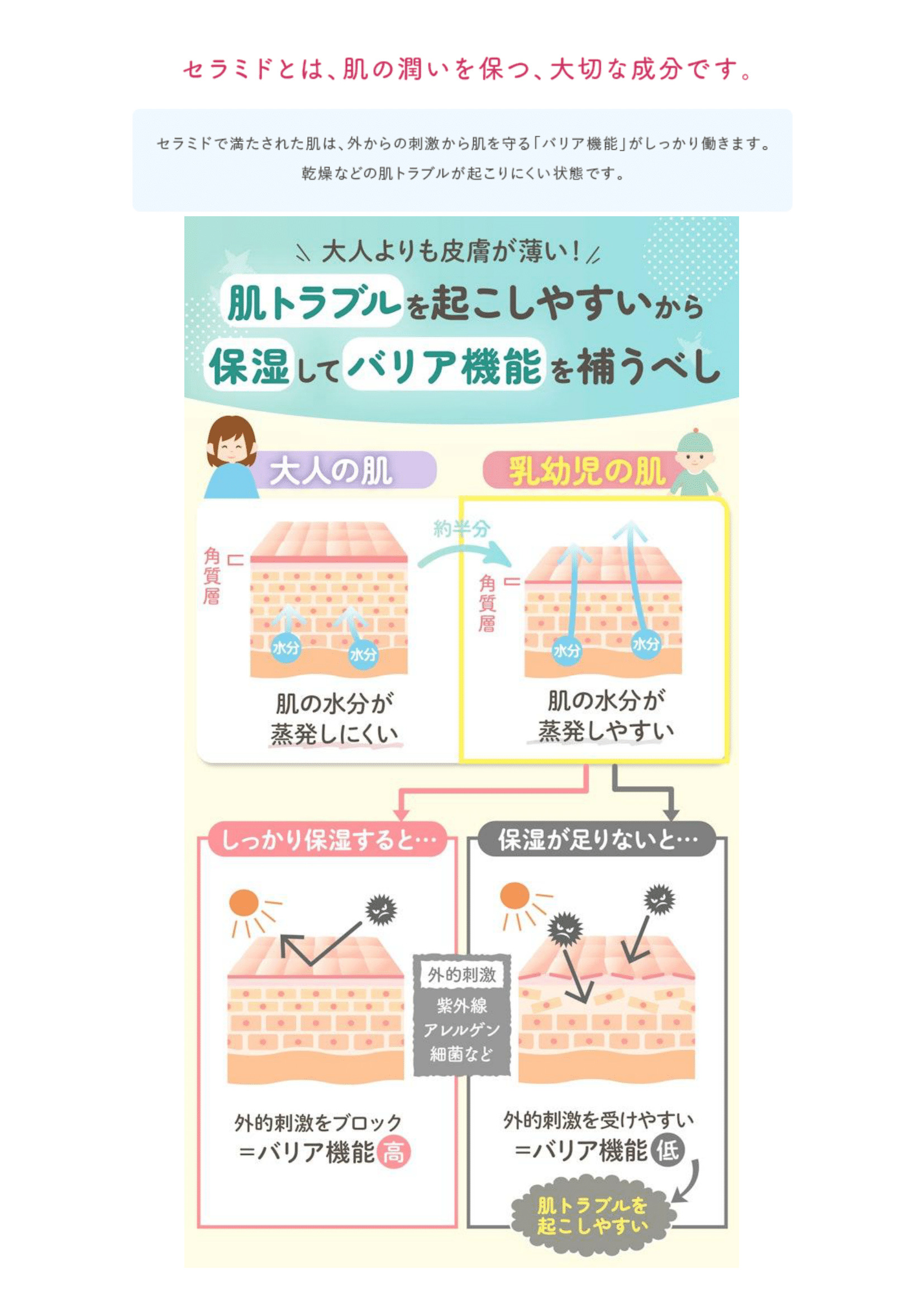 これ1本で化粧水・乳液・保湿クリームの役割を兼ね、忙しいお母さん・お父さんの夜中のケアにも最適。朝晩2回でOK。 ベタつかず、しっとりと肌になじむテクスチャー。5,家族で使える安心処方・ギフトにもぴったり