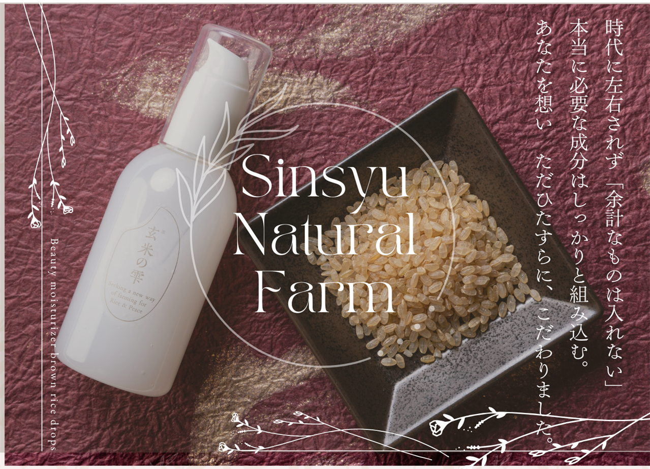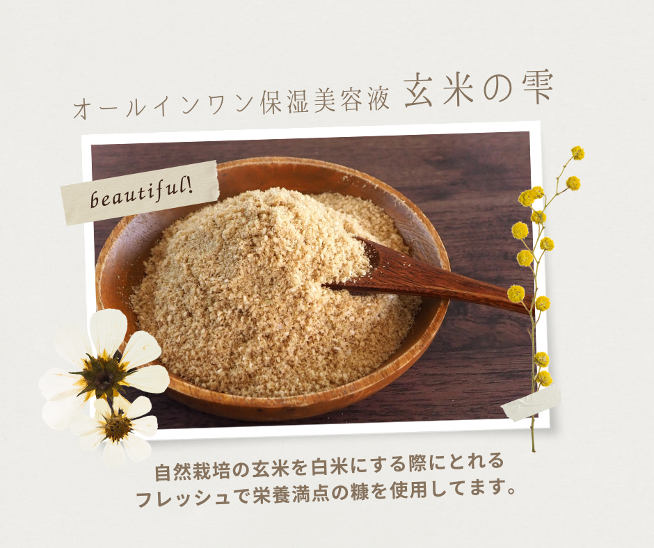 農薬・化学肥料・除草剤を使わず育てた玄米を精米直後に米ぬか化し、すぐに真空パックで美容液工場へ。鮮度を保った“生命力ある成分”を肌に届けます。2,9つの無添加でつくる“素肌ケアのシンプルさ”