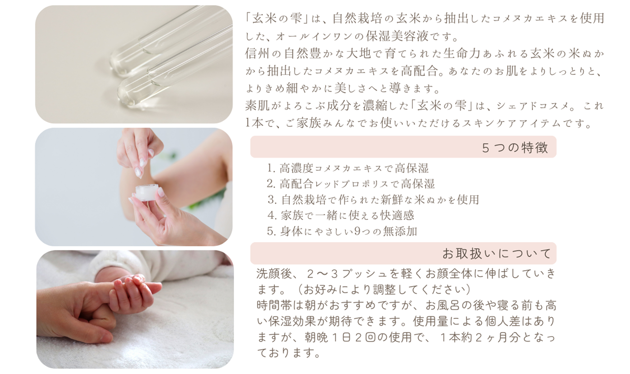 「玄米の雫」は、信州・自然栽培の玄米から抽出した米ぬかエキスを高配合し、赤ちゃんの繊細な肌をやさしく包む、無添加オールインワン保湿美容液です。肌に余計な負担をかけず、潤いと守りを一滴に込めて作り上げました。【こだわりポイント】